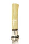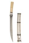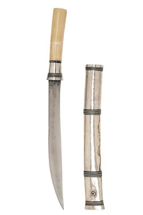 mid 19th century, with slightly curved spear-point 12in. blade, circular solid white metal tapering mount with carved beaded bands to the plain walrus-tusk turned hilt and complete with its solid white-metal scabbard with en-suite decorative bands and graduating from circular to flat in cross-section
