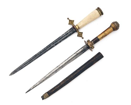 both circa 1800, the first with 7 1/2in. narrow stiletto blade with traces of etching for its full length (stained and worn), central narrow fuller, gilded brass straight cross-guard with diamond shaped panels carved with floral decoration and ball tips, chequered ivory tapering hilt, carved cap, the top bearing a relief engraving of a cloverleaf (no scabbard), the second with cruciform 7 1/4in. narrow blade (cleaned), oval brass plate below the ball ended cross-guard (quillions removed), tapering turned ivory hilt with white metal collar and ball pommel mounted with a brass lion mask pommel-cap and the majority of its original scabbard