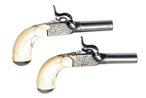 Belgian circa 1835, with round 1 1/2in. etched damascus barrels (cleaned), muzzles squared for a key (missing), squared scroll engraved boxlock actions with the hammers off-set to the right, carved nipple bosses, concealed automatic triggers, smooth bag-shaped ivory butts (old inlet repairs and age cracks) and with iron butt-caps possibly concealing traps (frozen).