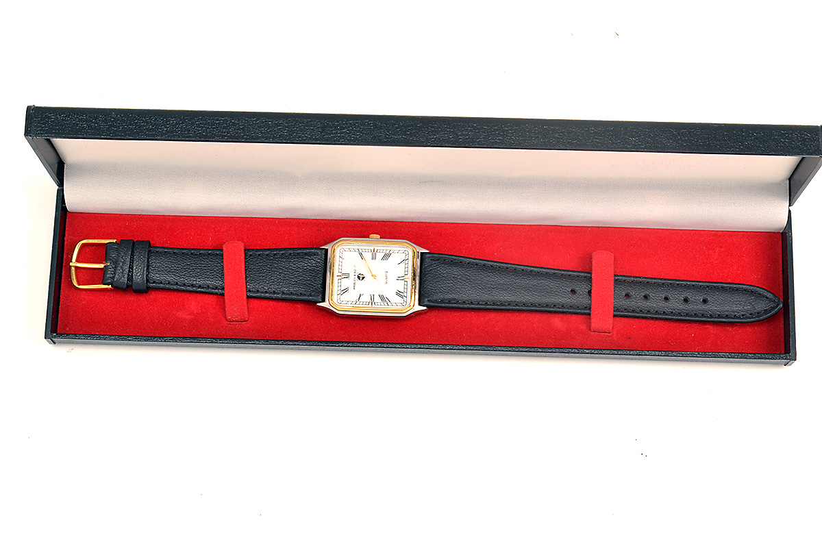 A COLLECTIBLE BOXED WEBLEY & SCOTT QUARTZ WRISTWATCH, of rectangular form, unused but requires fresh battery, in its makers display carton