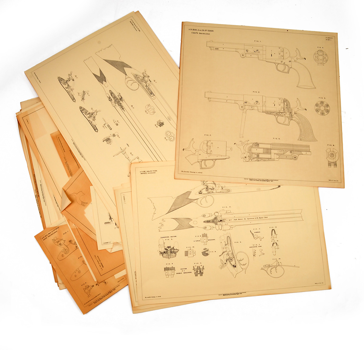A COLLECTION OF DRAWINGS (PRINTS) OF BLUE PRINT TYPE VINTAGE GUNS, (2)