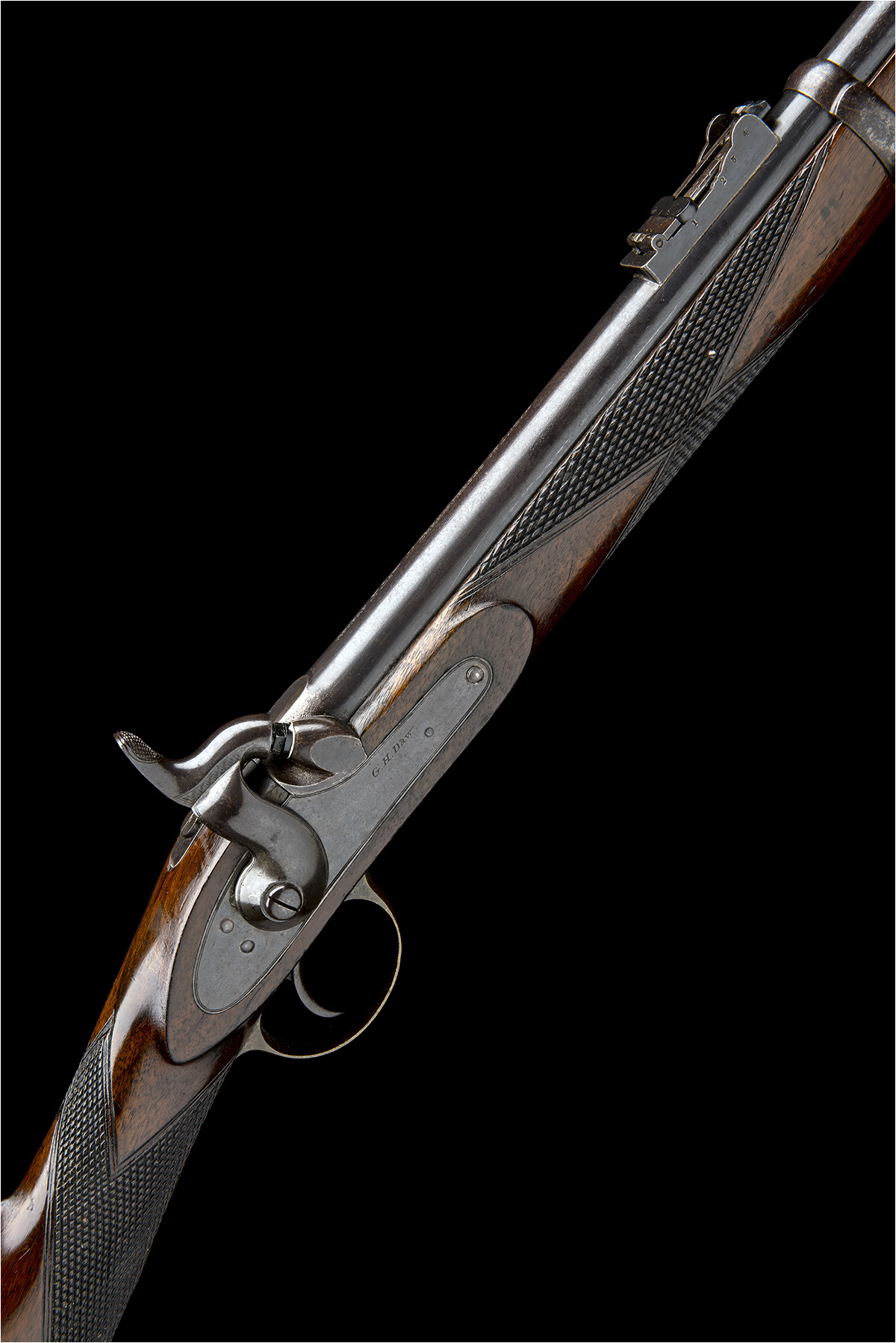 circa 1856, with 33in. barrel signed 'G.H. DAW 57 THREADNEEDLE ST. LONDON', the breech with ordnance proof stamps, block and blade fore-sight, elevating ladder rear-sight, solid top-tang, plain borderline engraved colour hardened lock signed 'G.H. DAW', chequered walnut full-stock with brass furniture except two iron barrel-bands and jag-ended ramrod
