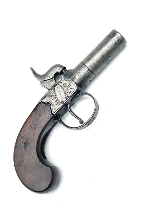A 40-BORE PERCUSSION BOXLOCK POCKET-PISTOL SIGNED 'NOCK, LONDON', no visible serial number, circa 1835, with round turn-off 1 5/8in. barrel, Birmingham proofs, squared engraved central hammer action with guarded trigger and slab-sided walnut butt (hairline cracks, loose on frame)