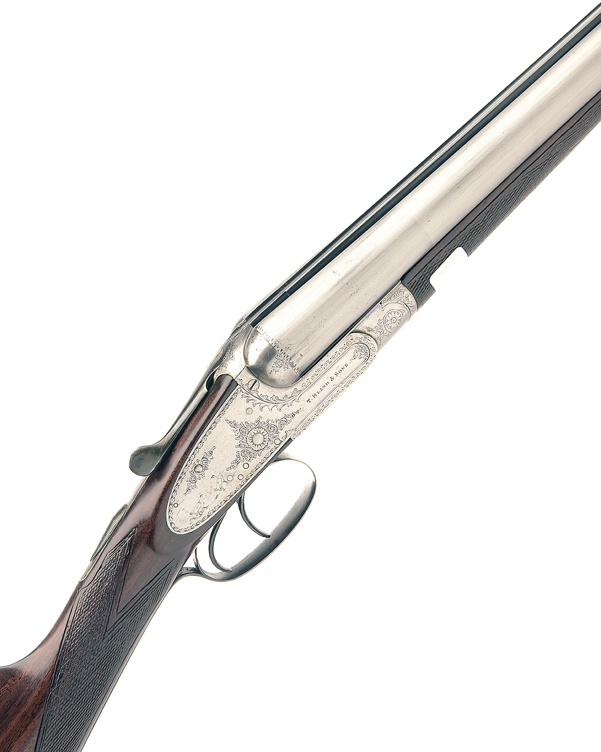 T. BLAND & SONS 12-BORE SIDELOCK EJECTOR, serial no. 16418, 28in. nitro reproved sleeved barrels (struck off), the rib engraved 'T. BLAND & SONS. 2 KING WILLIAM ST. STRAND. LONDON.', 2 1/2in. chambers, bored approx. imp. cyl. and 3/4 choke, treble-grip action, automatic safety with gold-inlaid 'SAFE' detail, border and acanthus scroll engraving with naive scenes of fowl, brushed bright and blued finish overall, 14 1/4in. stock including rubber recoil pad, fore-end with Deeley & Edge release catch and horn finial, weight 6lb. 15oz.