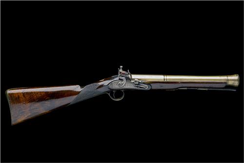 circa 1790, with two-stage 14in. barrel with moulded band at the intersection and flared banded cannon muzzle, the top-flat at breech signed 'LONDON', engraved band at rear of breech and solid engraved iron top-tang, flat curving step-tailed lock signed 'THOMAS & STORRS', roller to the frizzen spring, walnut full-stock chequered at the wrist, the top of grip section inlet with a brass shield-shaped escutcheon, brass furniture and horn tipped wood ramrod