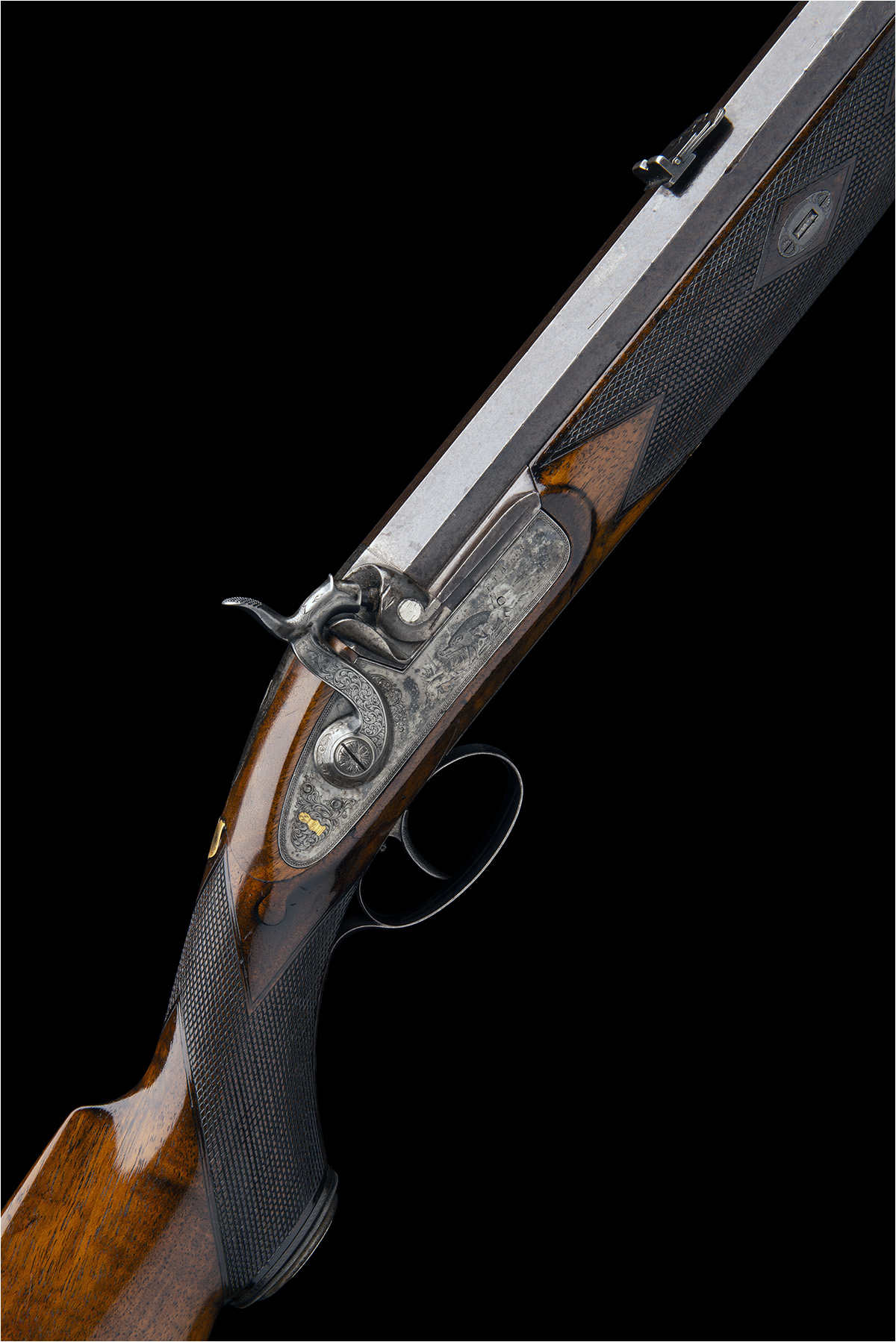 circa 1850, with substantial browned octagonal 32in. damascus barrel rifled in two grooves for belted ball, dove-tailed boat-shaped crescent fore-sight, standing notch rear-sight with three additional folding leaves, the top-flat signed 'FREDERIC T. BAKER, LONDON', squared patent breech engraved with bands and a fully scroll engraved top-flat, moulded snail with platinum plug, fully engraved top-tang with central depiction of a prowling tiger, border engraved lock signed 'F.T. BAKER' featuring a gamescene of a boar being set on by hunting dogs to the bar and a scroll engraved panel at the tail inset with a gold flaming urn, scroll engraved dolphin headed hammer, chequered pistol grip walnut half-stock (cracked through and expertly repaired behind lock, inlet repair above lock), iron circular patchbox to right hand side of butt with scroll engraved hinge, the lid with an engraving of a tiger with prey, chequered iron heel-plate, the top-spur carved and engraved as a Corinthium column topped with an inlet gold flaming urn, the same device repeated on the fore-end finial, raised cheek-piece, fully engraved iron grip-cap, chequered single set trigger and substantial brass cup-ended ebony ramrod, weight approximately 11 3/4lbs.