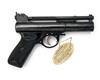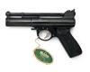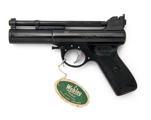 with blued 6 5/8in. barrel, sliding barrel-latch, adjustable rear-sight, blued stepped air-chamber with the model details on the left hand side picked out in white paint, 'Birmingham 4' address to the right hand side, four-pin trigger-unit with weight adjuster and black bakelite chequered grips, appearing very little used and still retaining its paper Webley swing ticket, in its maker's pale blue and grey card carton with instructions inside lid, the tray containing targets and the cleaning brush together with remnants of the spare washer envelope and the two spare washers (loss to one corner of tray)