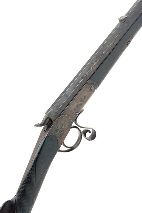 A .360 (ROOK) SINGLE-SHOT SPORTING-RIFLE SIGNED HOLLAND & HOLLAND, serial no. 5523, additionally numbered '1860', with octagonal 28in. barrel, standing notch and twin folding leaf rear-sight, scroll engraved scalloped action with front mounted under-lever and central hammer, walnut butt-stock and fore-end, action loose
