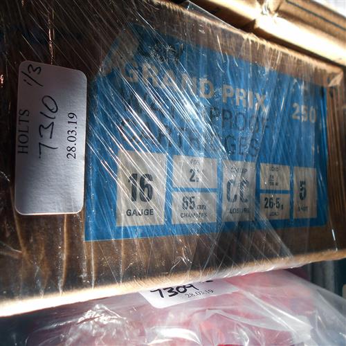 549 16 BORE CARTRIDGES comprising of: 225 Three Crowns photoplaswad 1 oz. 6 shot 2 1/2in., 24 mixed Gamebore 6 shot 28 gram 2 1/2in. some felt some photoplaswad wad, 25 Gamebore 6 shot 2 1/2in. 28 gram felt wad, 250 Eley Grand Prix 15/16ths oz., 2 1/2in' 5 shot, 25 Swillington Shooting Supplies boxed 2 1/2in. 16/16ths oz., 6 shot wad unknown.