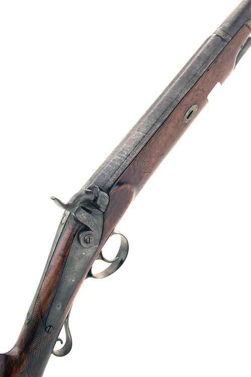 A 12-BORE PERCUSSION SINGLE-BARRELLED SPORTING-GUN, UNSIGNED, no visible serial number,