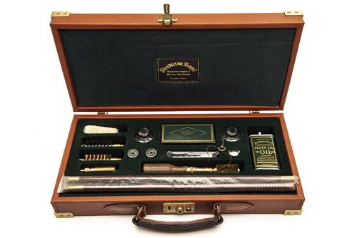 comprising of a three-piece cleaning rod, oil bottle, 12-bore snap-caps, mop, jag, brush, presented in a green baize-lined case