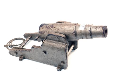 A HEAVY 10-BORE (BLANK) SALUTING-CANNON, UNSIGNED, serial no. 170121 for starting yachting races, with triple staged 12in. barrel and cast trolley with eyelets for board mounting, hinged breech and lanyard release, wight approximately 30lbs.