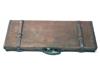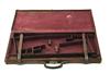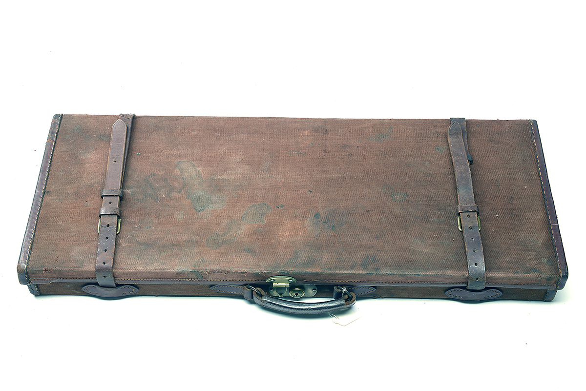 A CANVAS AND LEATHER DOUBLE GUNCASE, fitted for 30in. barrels, the interior lined with maroon baize, brass lock (key missing),