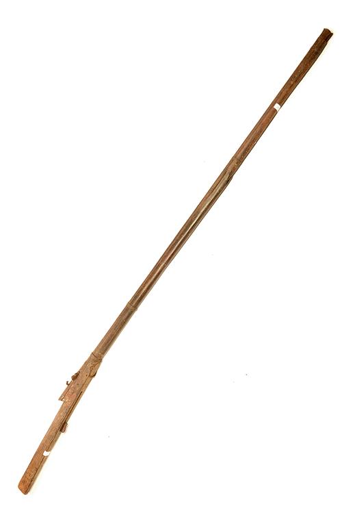 A LARGE INDIAN MATCHLOCK WALL-GUN, circa 1850, of approximately 8-bore with 72 1/2in. round iron barrel wood full stock of 'Torador' pattern, corroded with losses