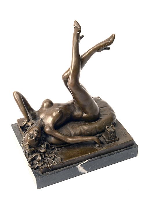 A BRONZE OF A NUDE RECLINING ON A CUSHION, lying on her back in a provocative manner whilst on the phone, the base of the bronze with an artists signature (illegible), the whole set on a marble base