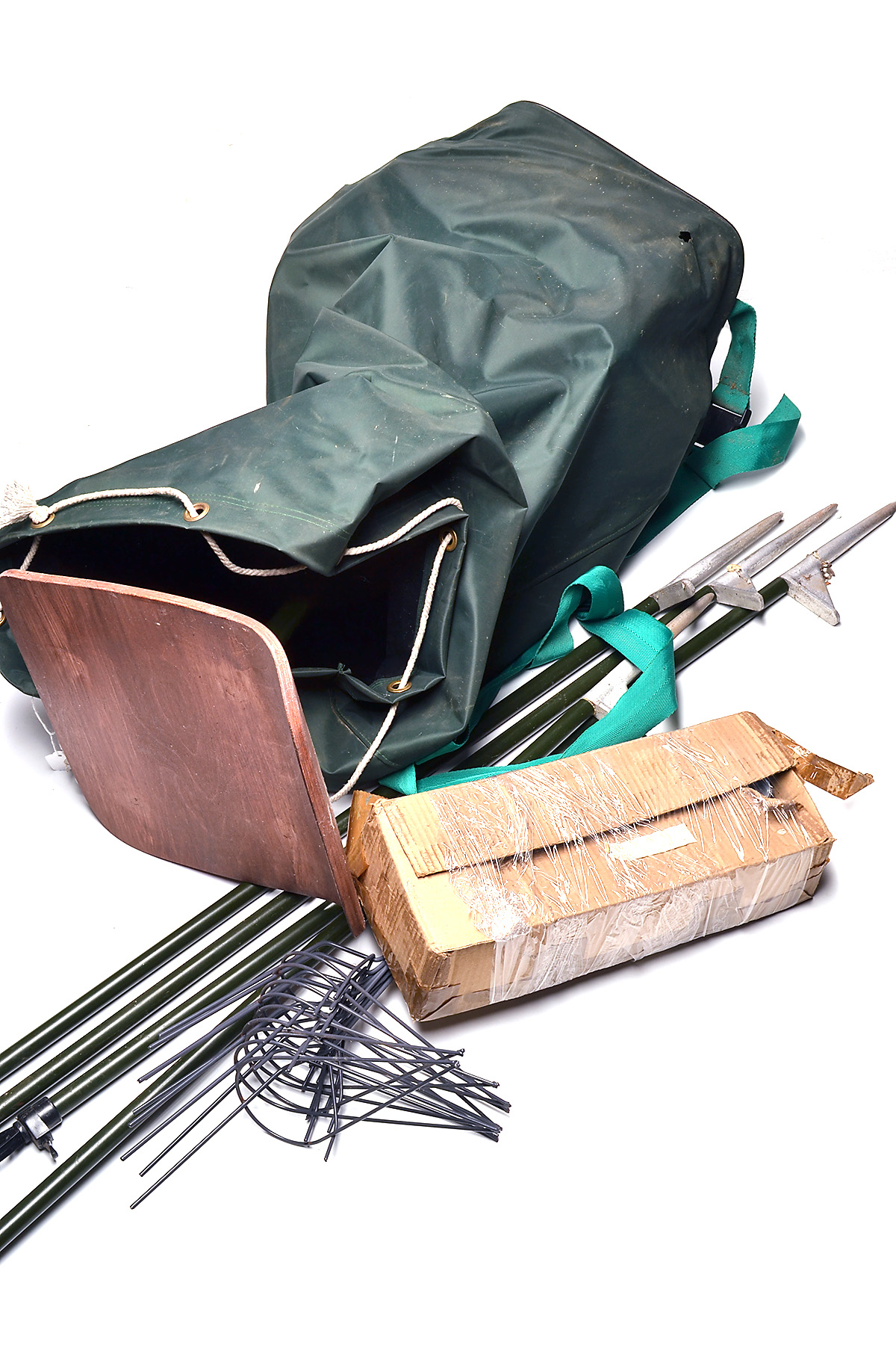 A COLLECTION OF PIGEON SHOOTING RELATED ITEMS, comprising of pigeon shooting kit in green holdall, camouflage netting, poles, swivel seat & decoys