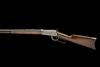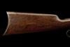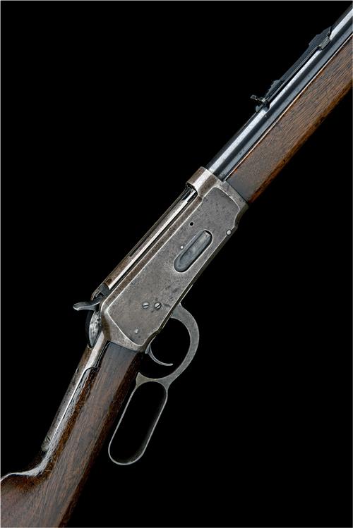 for 1913, with blued round 26in. barrel signed by the maker and with patent dates to 1894, dove-tailed blade fore-sight with locking screw, buckhorn rear-sight, slab-sided receiver with loading gate (finish stained), walnut straight-hand butt-stock with iron crescent heel-plate, plain walnut fore-end with iron nose-cap and full-length under-barrel magazine, fair amount of original finish, traces only to finger-lever