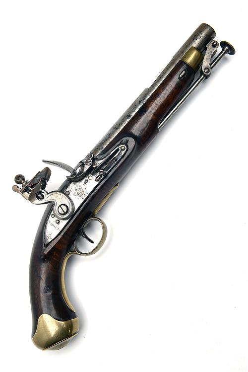 A .700 FLINTLOCK SERVICE-PISTOL SIGNED TOWER, MODEL 'NEW LAND PATTERN', no visible serial number, circa 1805, with brushed bright 9in. barrel, brushed bright lock with 'G.R.' crown device, walnut full stock with brass furniture and captive stirrup ramrod