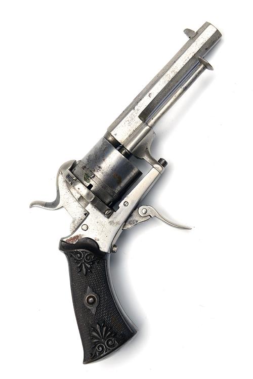 A 7mm PINFIRE POCKET-REVOLVER, UNSIGNED, serial no. 12, Continental circa 1860, with octagonal 3 1/4in. barrel, plain six-shot cylinder,, exposed hammer and folding trigger, flared, chequered and embossed gutta-percha grips, in the white, action frozen