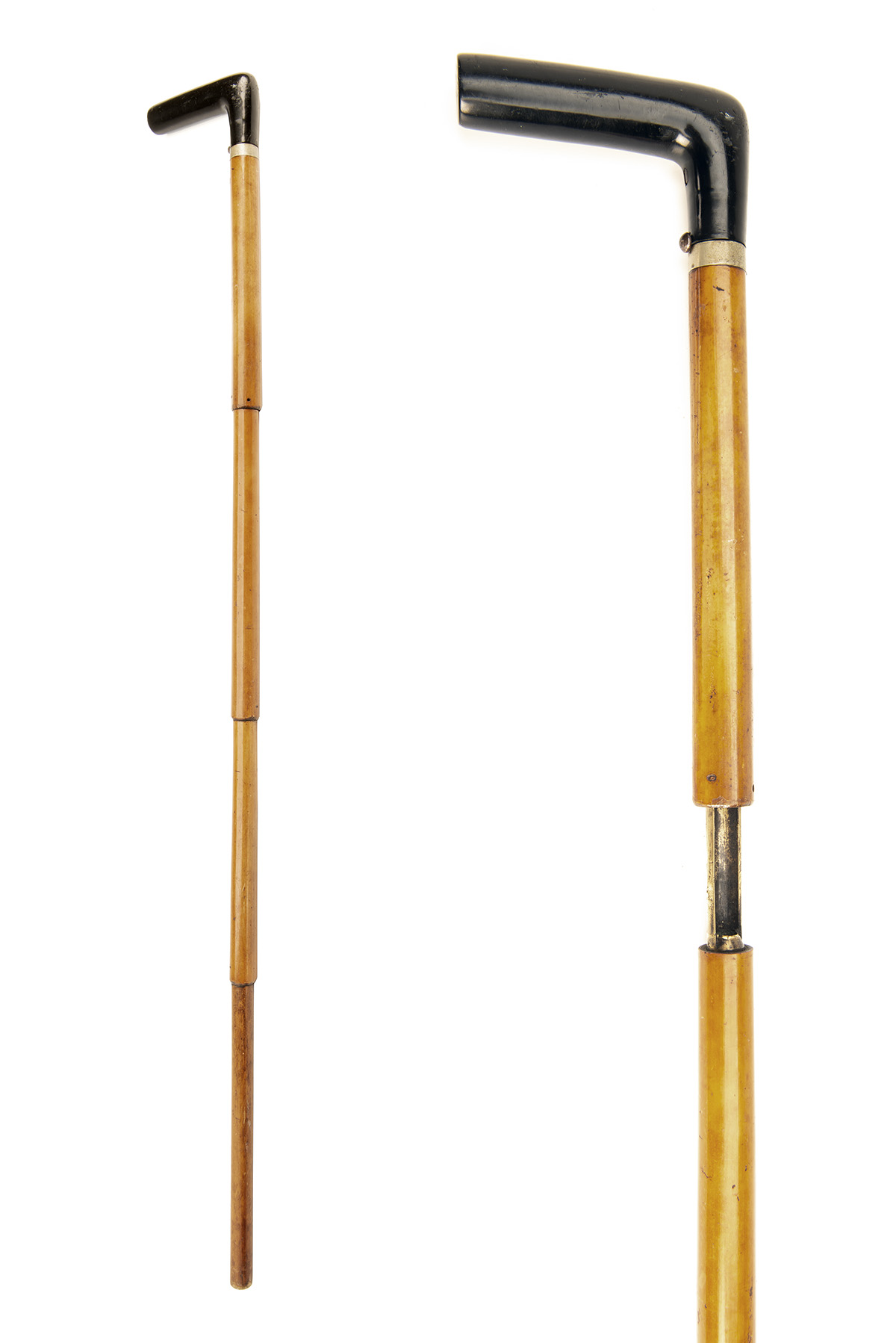 probably Belgian, circa 1875, with natural graduated cane-covered 24 1/4in. barrel section, twist and pull action with nickel band forwards of the black horn handle and exposed button trigger, 33 3/4in. overall, missing muzzle plug