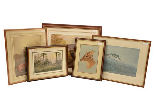A COLLECTION OF FIVE GAME SCENE PRINTS, comprising of a painting of a muntjac, mounted in a wooded frame measuring approx. 18in. x 14in., a framed limited edition print of a Roe deer by Mick Cawstone measuring approx. 18in. 14in., a print of a roe deer in the forrest measuring approx. 18in. x 14in. a framed print of a red stag measuring approx. 21in. x 17in., a framed print of a fish about to take the hook measuring approx. 24in. x 19in., a framed print of a stag in the wood measuring approx. 27in. x 23in.
