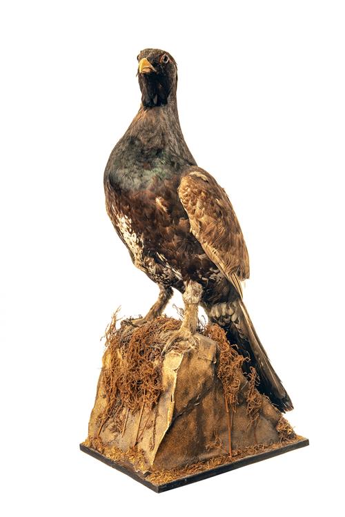 A FULL-MOUNT OF A CAPERCAILLIE, mounted on a heather strewn base, measuring approx. 33in. x 17in. x 11in.