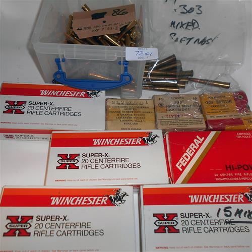 225 ROUNDS .303 AMMUNITION, comprising of 86 LIAI HXP ball, 10 Kynoch sn 215 grn 10 Kynoch mixed bullets, 10 Churchill Super 174grn target in original Leicester Square address carton for collectors., 14 mixed Kynoch. 60 Winchester 180 grn power point, 15 rounds mixed tip, 20 Federal 180 grn sn,