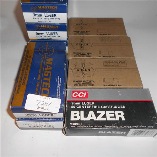 500 ROUNDS 9MM LUGER AMMUNITION, comprising of 300 Magtech 115grn FMC, 50 CCI 124grn JSP, 150 Green Shield Frangible.