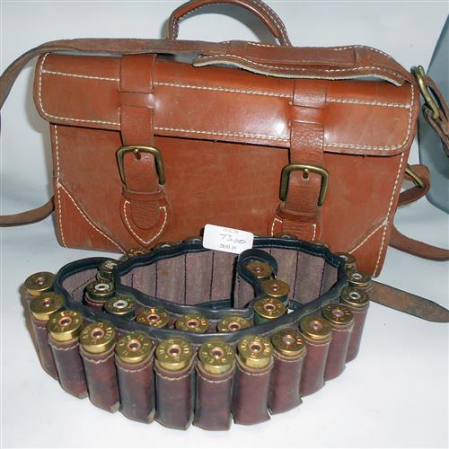 A SUPERB LEATHER SHOTGUN CARTRIDGE MAGAZINE WITH CARTRIDGE BELT AND 30 SHOTGUN CARTRIDGES