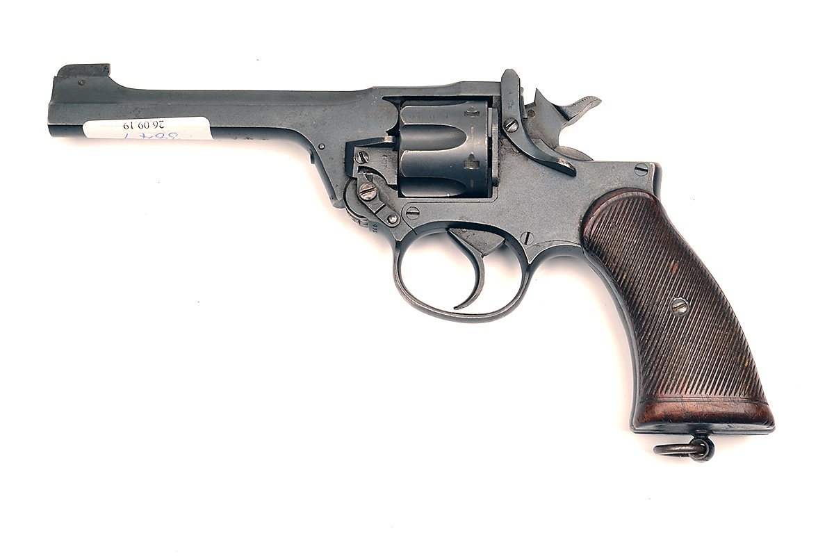 A .38 (200) SERVICE-REVOLVER SIGNED ENFIELD, MODEL 'No2MKI', serial no. G1160, dated for 1939, with 5in. barrel, break-open frame with auto-ejecting fluted cylinder, spurred hammer and grooved walnut grips with lanyard ring at heel, much finish