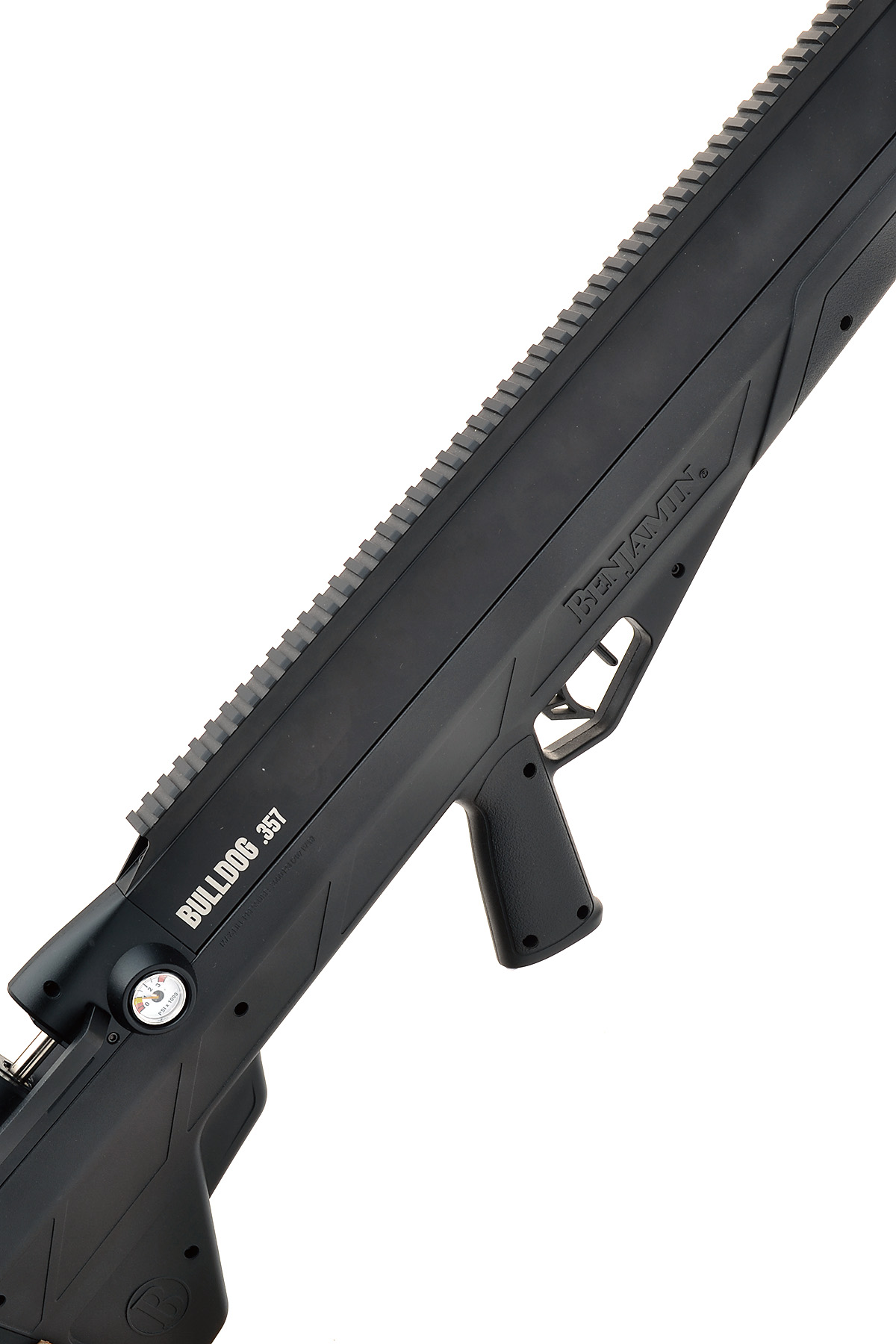 A BOXED FAC-RATED .357 PRE-CHARGED PNEUMATIC AIR-RIFLE SIGNED BENJAMIN, MODEL 'BULLDOG', serial no. 515J00102, with fully shrouded 30 1/2in. barrel, rear aperture for magazine (included), abs plastic bull-pup stock and full-length Picatinny rail, in its makers carton appearing unused with accessories
