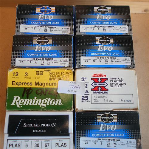 APPROXIMATELY 425 12 BORE CARTRIDGES 25 Hull Special Pigeon, 67mm, 6 shot, 30 gram, plaswad. 25 Winchester 3in, Magnum, 4 shot plaswad, 1 7/8ths oz, 125 Gamebore EVO 9 shot 28 gram 70mm plaswad competition load. 11 Remington 3in Magnum, 1 7/8ths load BB, Eley 67.5mm, 50 6 shot, 1 7.5 shot, 1 4s&5's, 4 8shot