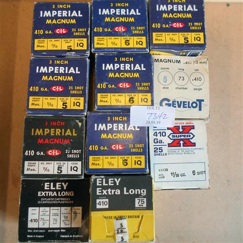 275 THREE INCH .410 CARTRIDGES, comprising of: 100 5 shot CIL Imperial Magnum 11/16th oz., 75 6 shot CIL Imperial Magnum 11/16th oz,., 25 Gevelot Magnum 6 shot, 25 Eley Extra Load 5 shot, 25 Eley Extra Long 6 shot, 25 Winchester 11/16ths oz, 6 shot.