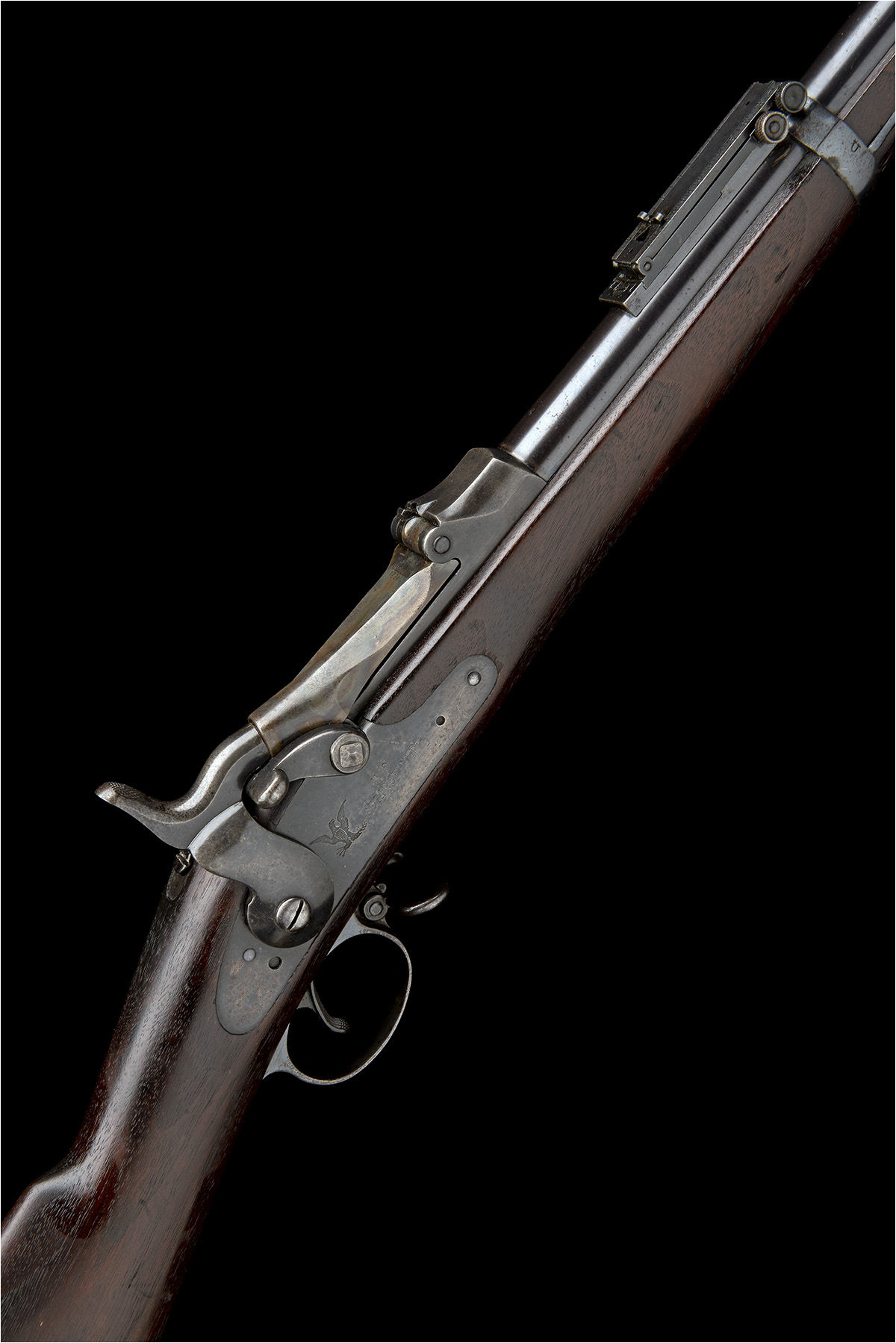 dated for 1891, with blued 32 1/2in. barrel, block and blade fore-sight, micro-adjustable rear-sight, colour-hardened model dated flip-up breech-block, colour-hardened lock marked with the American Eagle device and signed 'SPRINGFIELD', walnut full-stock with blued furniture, the left hand top of wrist stamped with a martial cartouche, two iron barrel-bands and iron nose-cap with concealed spike-bayonet, the whole retaining much apparent original blued finish and colour and complete with two tools and a proof certificate