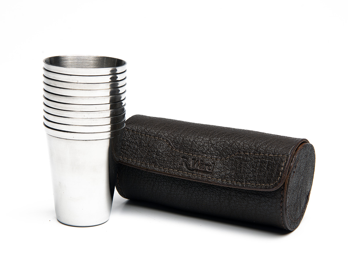 A RAY WARD UNUSED SET OF 10X70ml STAINLESS STEEL DRINKING CUPS WITH BUFFALO LEATHER CASE