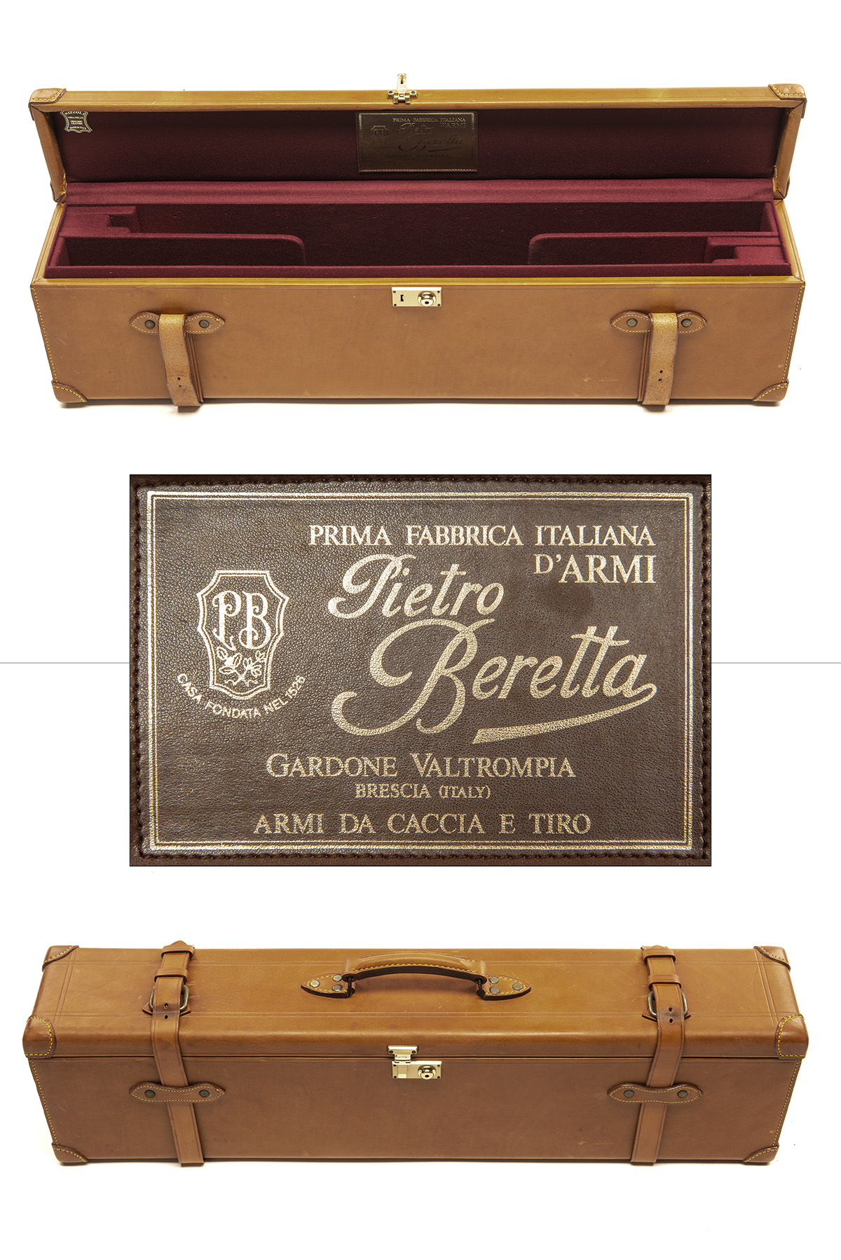 fitted for 28in. over and under barrels, (could adapt to 30in.) the interior lined with red baize, a Pietro Beretta trade label, brass lock (key missing)