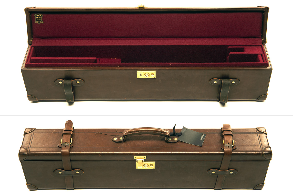 fitted for 72cm. or 78cm. over and under barrels, the interior lined with maroon baize, brass lock (key missing)