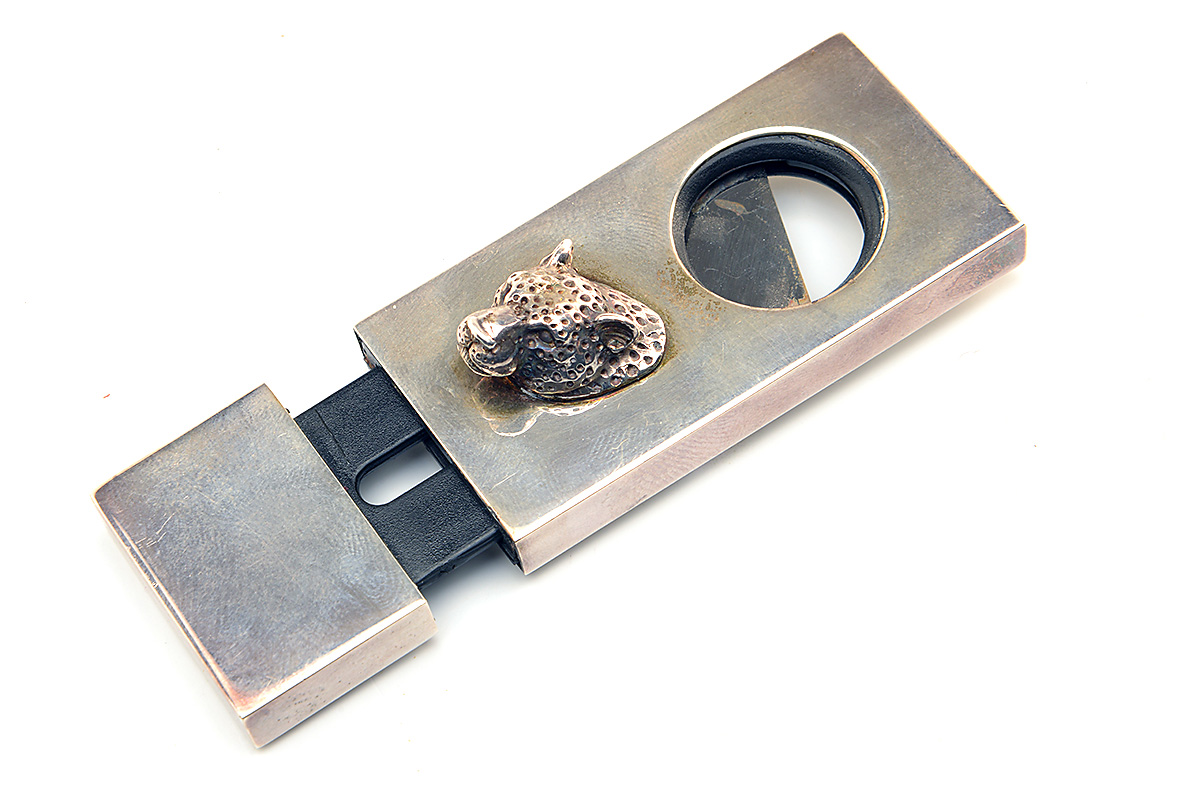 A STERLING SILVER CIGAR CUTTER, 925 hall marks, front with leopard head, measuring approx. 3 1/4in. x 1 1/4in.