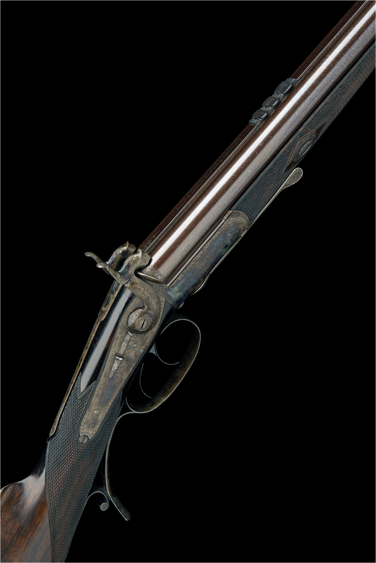 circa 1860, with rebrowned damascus 26in. side-by-side barrels, raised flat top-rib matted for the last 13 1/2in. and signed 'JOSEPH LANG' in gilt script and '22 COCKSPUR STREET, LONDON', detachable bead fore-sight, rear-sight with three flush-folding leaves, each with gold centreline, border and scroll engraving at breech, narrow standing breech with shallow carved percussion fences, borderline and scroll engraved elongated top-tang, borderline and scroll engraved back-action locks with sliding safes behind the dolphin headed engraved hammers, each with the eyes picked out in gold, the locks signed 'JOSEPH LANG' in crescent panels, figured walnut butt-stock chequered at the wrist, raised cheek-piece, engraved iron furniture including finely chequered pistol-grip spur to the lower tang, single bite forward-facing swing-lever opening, fully chequered walnut splinter fore-end with cross-key fixing and complete with a period walnut storage case refitted for this rifle and lined in burgundy baize with replacement trade label to inside of lid and containing a take-down cleaning rod and square nickel oil-bottle, the gun fully renovated and refinished to a high standard throughout