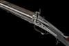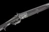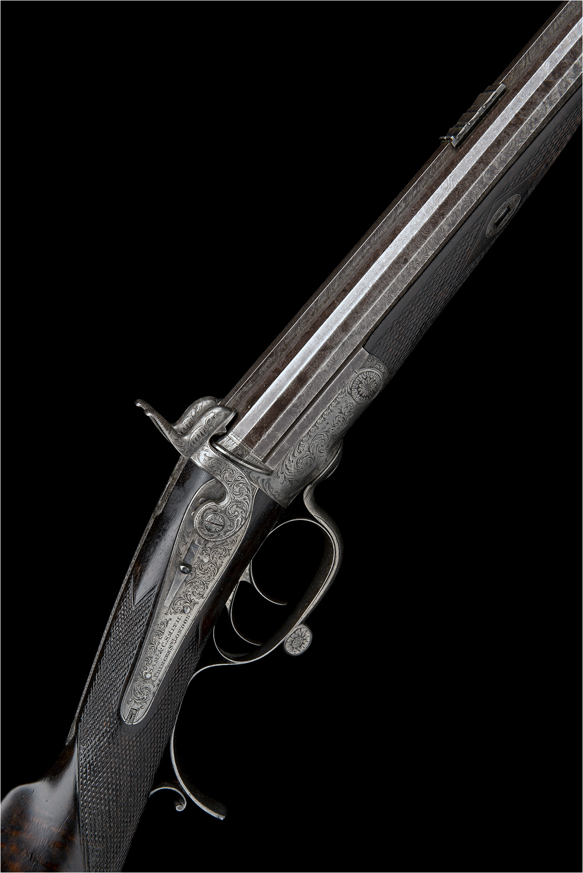 circa 1860, with unusual damascus polygonal 28in. side-by-side barrels, raised flat top-rib matted for the last 5in. and signed 'SAML. & C. SMITH PRINCES STREET LEICESTER SQUARE, LONDON', dove-tailed bead fore-sight, rear-sight with shallow standing notch and three flush-folding leaves, border and scroll engraving at breech, narrow faceted standing breech with shallow carved percussion fences, borderline and scroll engraved elongated top-tang and shallow sighting groove, borderline and scroll engraved back-action locks with sliding safes behind the dolphin headed engraved hammers and signed 'SAML. & C. SMITH PRINCES ST. LONDON', figured walnut butt-stock chequered at the wrist, engraved iron furniture including finely chequered pistol-grip spur to the lower tang, single bite swing-lever opening, fully chequered walnut splinter fore-end with cross-key fixing and fitted with eyelets for sling, complete with a period leather storage case possibly associated and lined in burgundy baize, replacement trade label to inside of lid