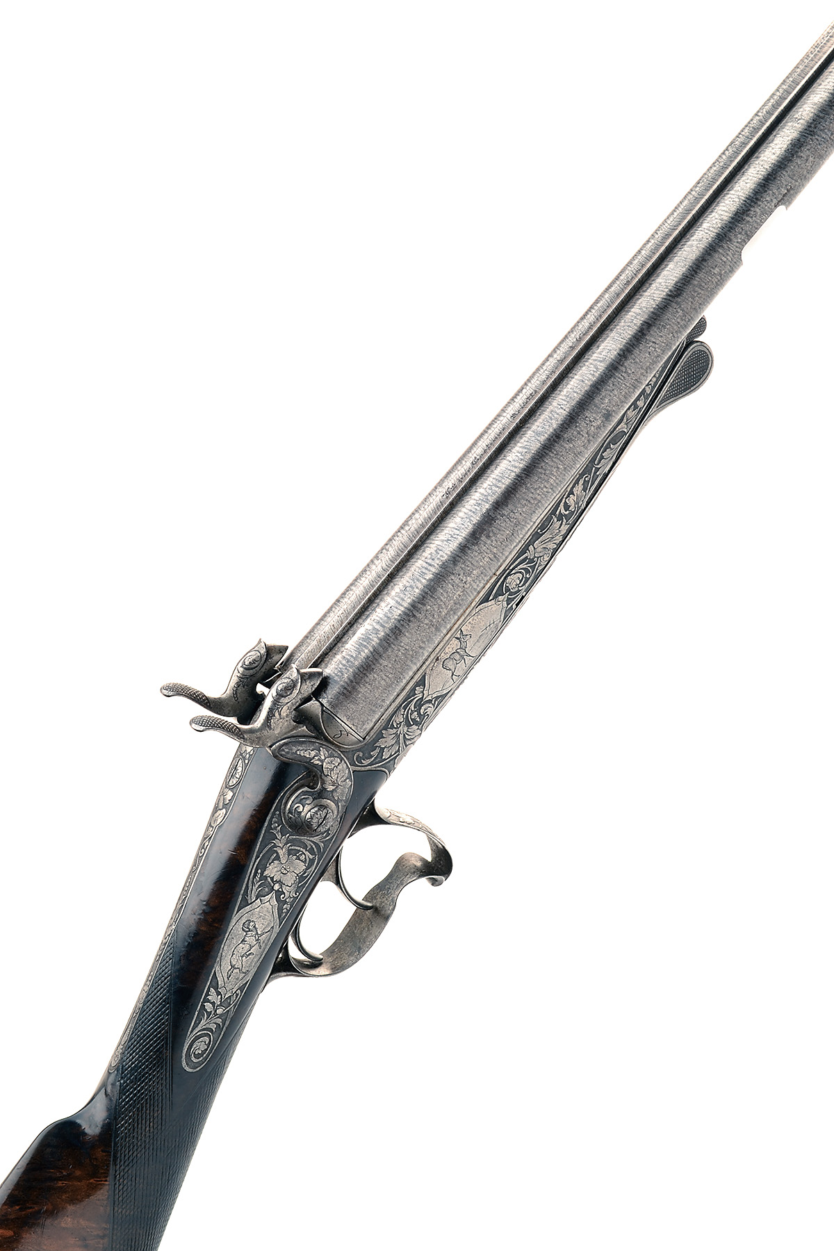 A 20-BORE PINFIRE DOUBLE-BARRELLED SPORTING-GUN SIGNED GASTINNE RENETTE, PARIS, MODEL 'LEFAUCHEUX PATENT', no visible serial number, 10419 made for a boy or lady, with 23 3/4in. damascus barrels signed on the top-rib, chisel engraved action, lock and hammers and figured walnut butt-stock, swing lever in lieu of fore-end