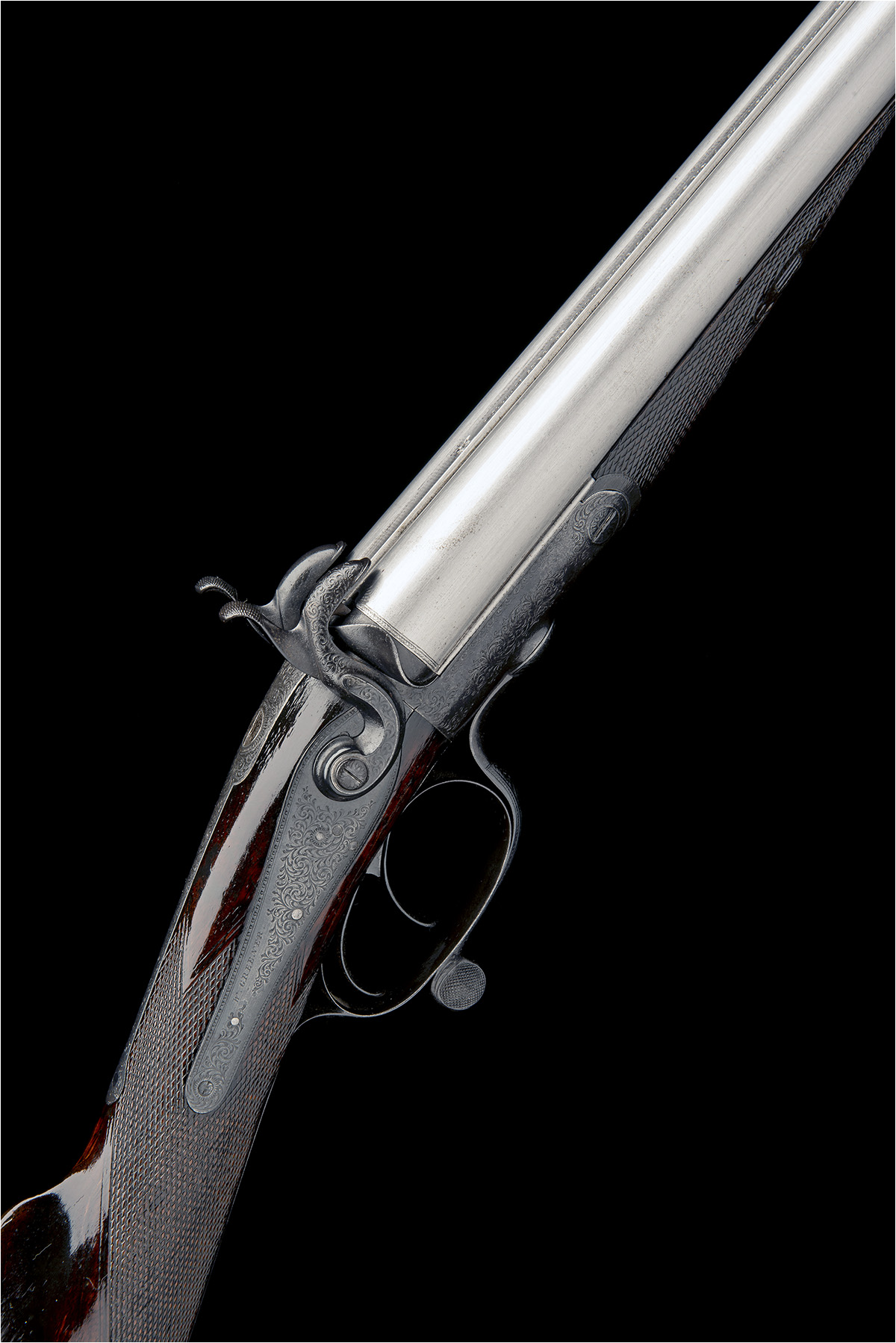 circa 1865, with brushed bright 30in. barrels, the matted top-rib signed within a panel 'WILLIAM GREENER, MAKER, RIFLE HILL WORKS BIRMINGHAM. SUPERIOR LAMINATED STEEL' (renewed), scroll engraved long top-tang, carved shallow fences, border and scroll engraved back-action locks signed 'W. GREENER', chequered walnut straight-hand butt-stock, engraved iron furniture, double-bite swing under-lever, shield shaped escutcheon, scroll engraved rounded action body and chequered walnut splinter fore-end