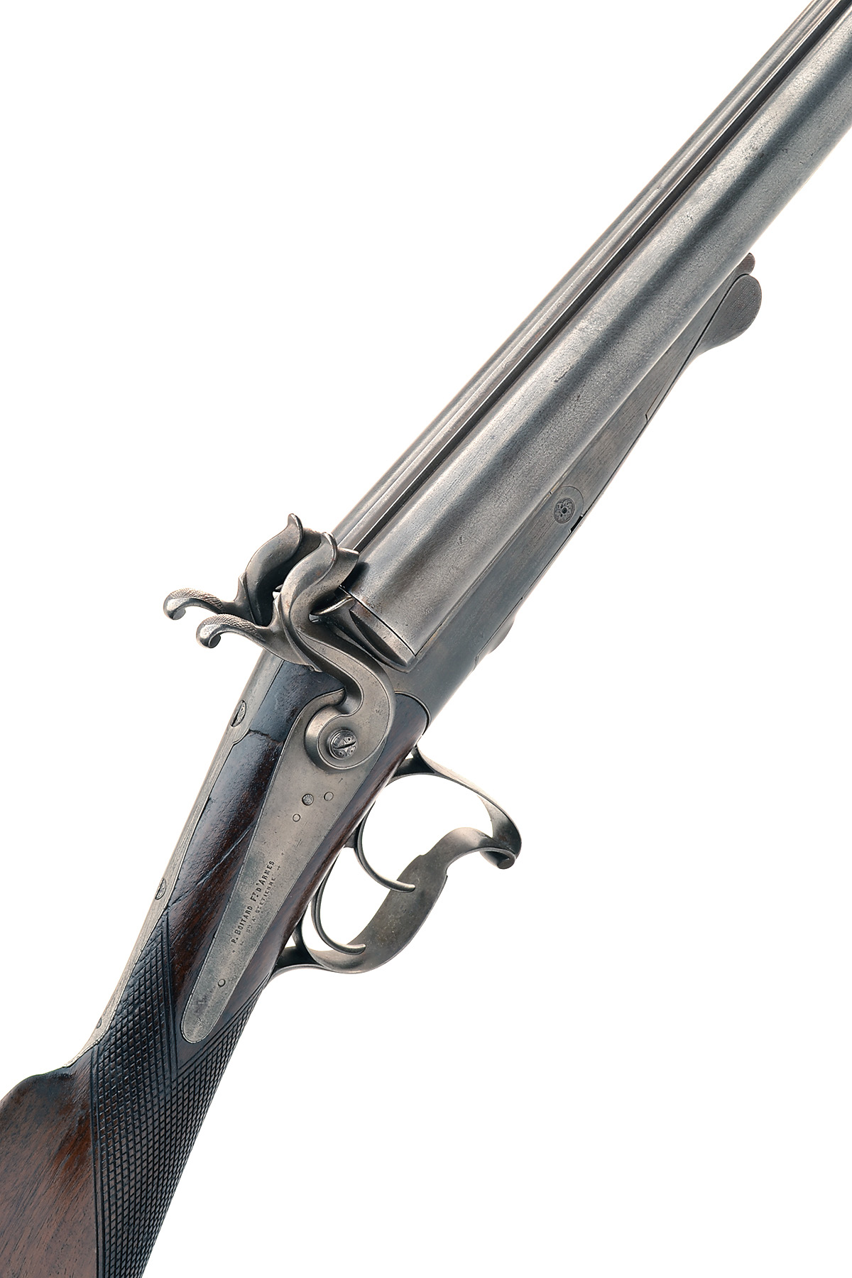 A 10-BORE PINFIRE DOUBLE-BARRELLED DUCK-GUN SIGNED P. BOITARD, ST ETIENNE, serial no. 857, circa 1875, with heavy damascus 29 1/2in. barrels, the top-rib marked 'DEPOT A PARIS BOULEVARD DE SEBASTOPOL '131'', plain back-action locks signed 'P. BOITARD FT. D'ARMES BTE. A' ST ETIENNE', chequered walnut butt-stock (repaired at head), iron fore-end with Lefaucheux lever opening, finish removed