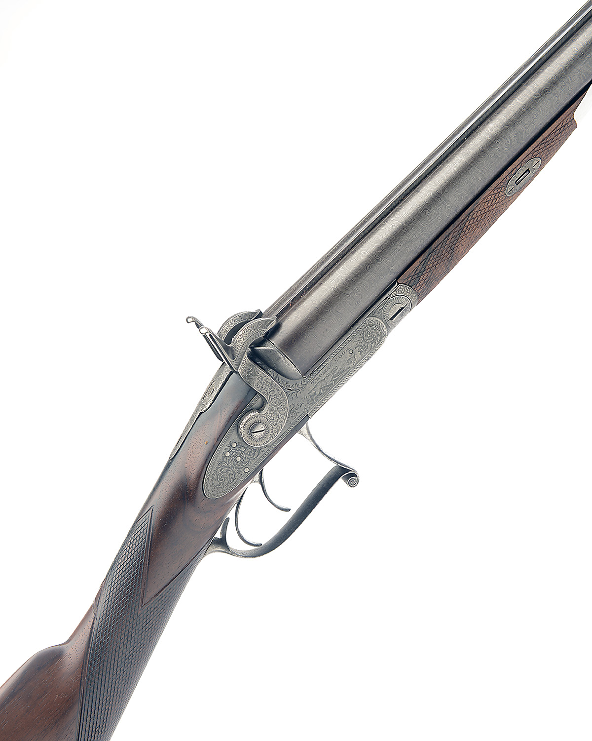 THOMAS COOK 12-BORE TRIGGERGUARD-LEVER PINFIRE HAMMERGUN, serial no. 3270, likely conversion from muzzle loading, 29 3/8in. bold damascus barrels, slender serpentine fences, standing breech and top tang with later dovetailed slot and aperture (possibly for additional bolt locking device, not present), flat side hammers, pull-back triggerguard opening, bold acanthus scroll engraving with ropework bordering, the lockplates with game scenes of hound and fowl, some patination overall and scarring to underside, 14 3/8in. figured likely replacement stock including steel buttplate, replacement fore-end wood, weight 7lb. 2oz.
