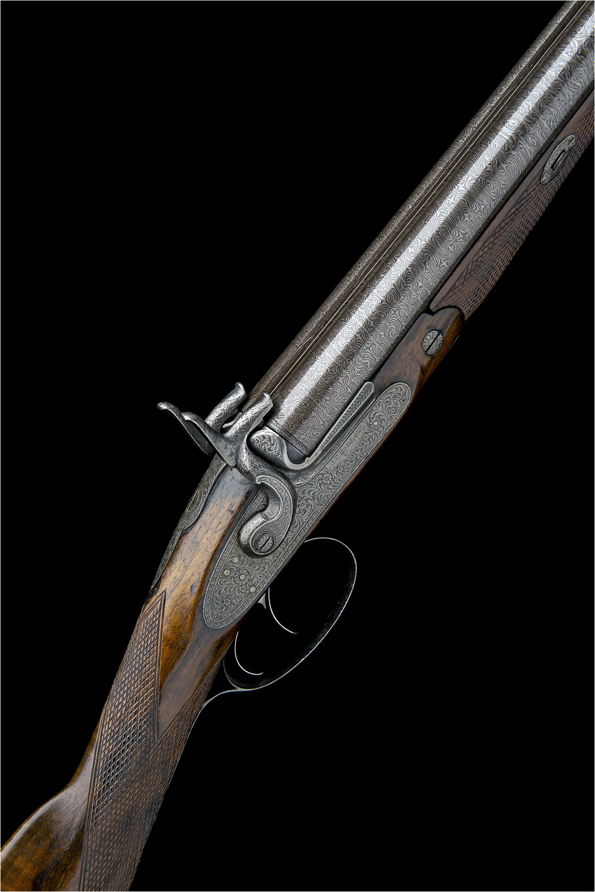 29in. bold damascus barrels, rib engraved with a banner with Harlow details (worn), possible conversion from muzzle loading, carved serpentine fences (repair to right side of the standing breech), sidelocks with ornately carved hammers, J.T. and E. Harlow patent breech loading drop-down barrel, patent no. 2380 of September 28th 1863, use number 705, bold acanthus scroll engraving, the underlever with scrolling banners engraved 'PATENT', 'WEDGE BOLT', 'NO. 705', pineapple finial, the fore-end with possible replacement wood and arrowhead insert foreward of the toplever, 13 7/8in. highly-figured stock with repair to toe and steel buttplate
