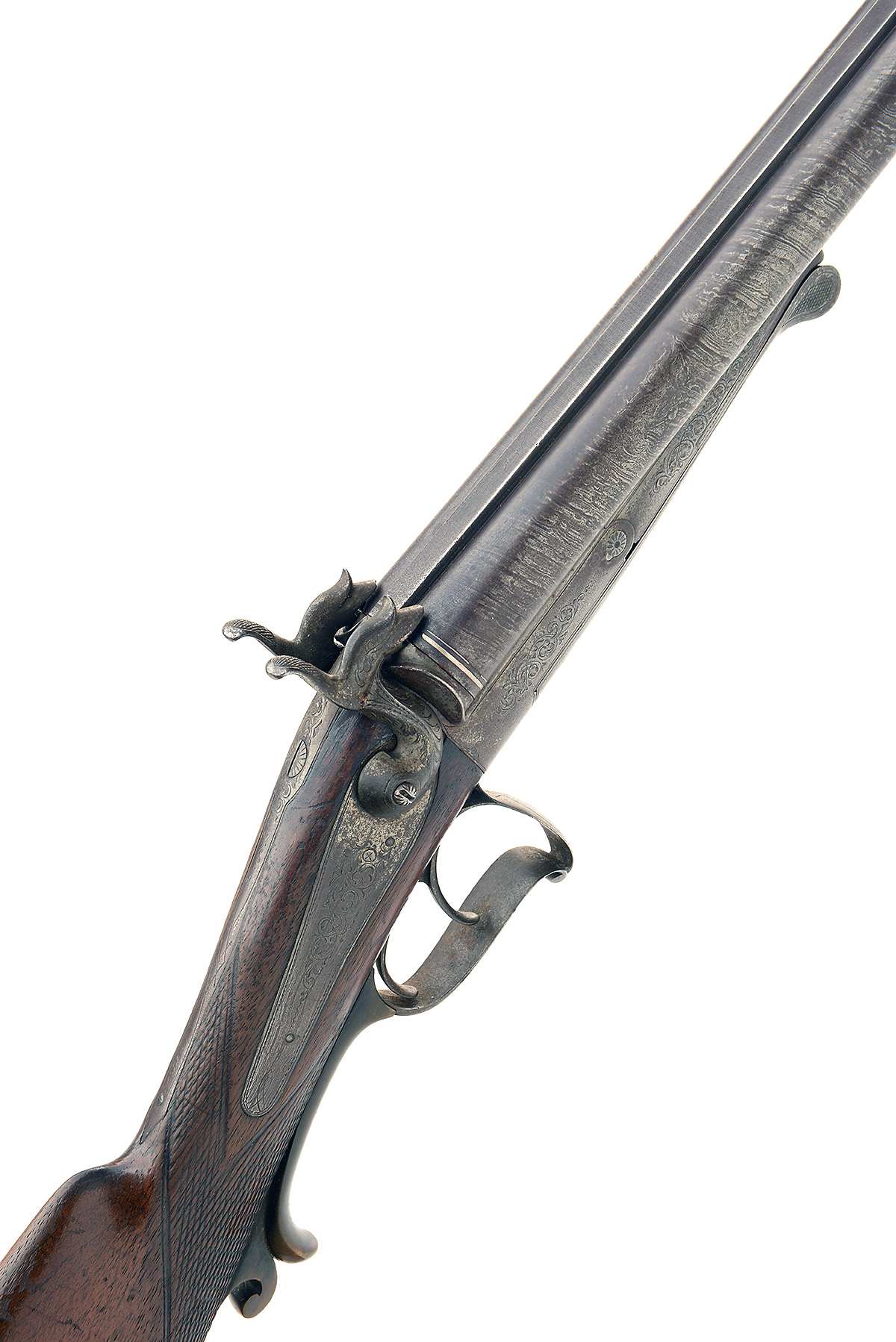 A 12-BORE PINFIRE DOUBLE-BARRELLED SPORTING-GUN, UNSIGNED, MODEL 'LEFAUCHEUX PATENT', serial no. 3856, circa 1860, with twist 29 3/4in. barrels, border and scroll engraved back-action locks, walnut butt-stock chequered at the wrist and with raised cheek-piece, engraved iron fore-end and forwards facing swing lever opening