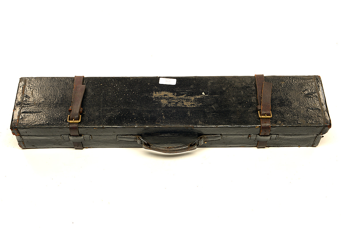 A TARRED CANVAS SINGLE GUNCASE, fitted for 30in. barrels, the interior line with green baize, brass lock 9key missing)