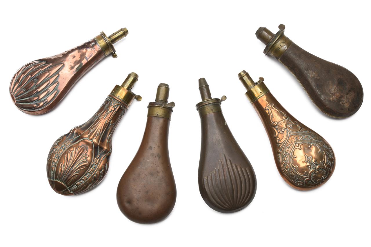 A GROUP OF SIX MIXED CONDITION POWDER FLASKS FOR SPORTING GUNS, mid-late 19th Century, all approx 8 in., 1) copper and brass, graduated spout marked 'G & JW HAWKSLEY', embossed both sides with stylised ferns, spring broken; 2) copper and brass, graduated spout marked 'G & JW HAWKSLEY', embossed both sides with stylised foliage and shells, spring broken, dented on one side; 3) copper and brass, plain bag, graduated spout, body dented; 4) copper and brass, graduated spout, cap marked 'BATTIE / PATIENT', embossed both sides with stylised fern, spring broken; 5) copper and steel, graduated spout, cap marked 'EXTRA / QUALITY' and 'SYKES / PATENT', neck engraved 'STOLEN FROM J. R. COOKES', spring broken, missing leather cover; 6) copper and brass, graduated spout, embossed both sides with stylised ferns, spring broken, heavily dented both sides;