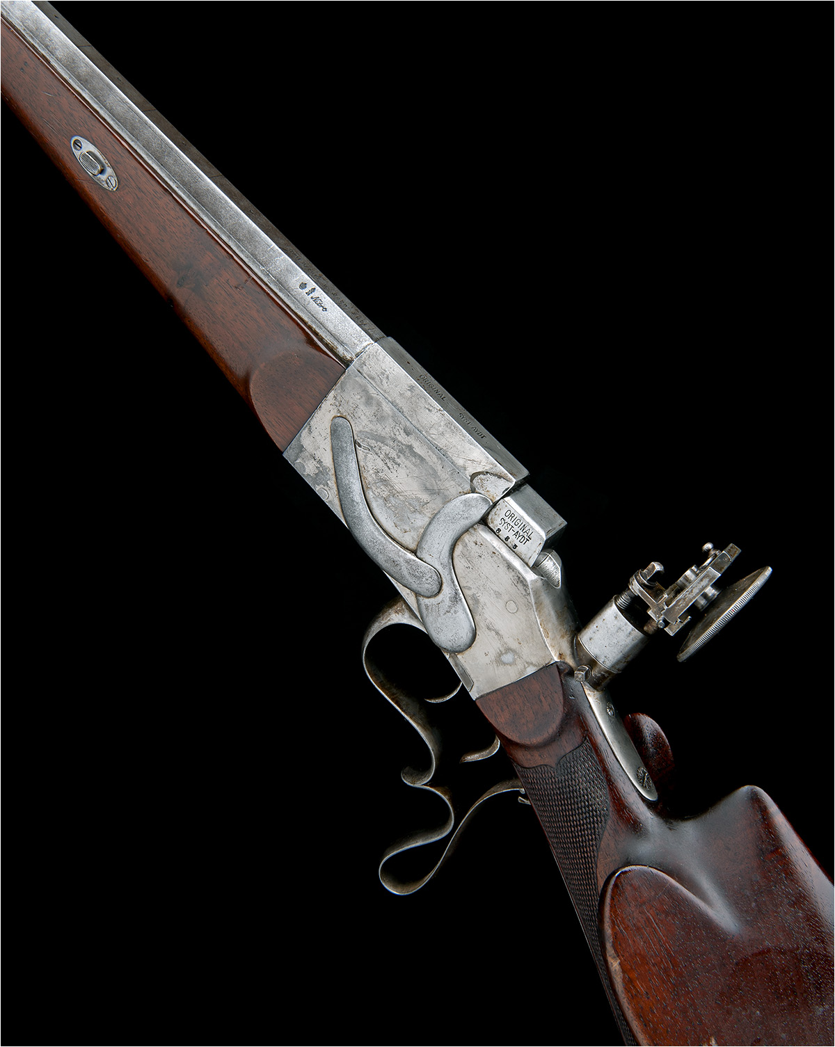 circa 1925, with octagonal 31 1/2in. barrel, the top-flat signed 'EMIL KERNER U SOHN SUHL' and 'ORIGINAL SYSTEM AYDT', dove-tailed ramp tunnel fore-sight, no provision for rear-sight, plain slab-sided receiver fitted with large banana-shaped tensioning springs to the pins and strong traces of nickel-plated finish, square form dropping breech, top-tang with pan-headed adjustable aperture sight, chequered walnut tyrolean butt-stock, iron Swiss-style heel-plate, complex underlever forming the trigger-guard bow, double-set triggers, smooth walnut fore-end with moulded tip and fitted with iron sling swivels,
