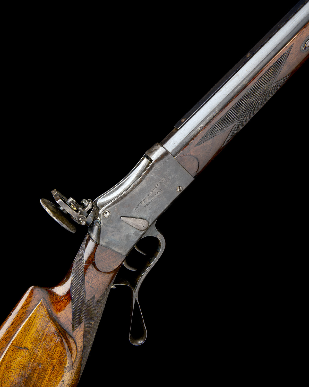 circa 1930, with blued 31in. heavy octagonal barrel with cleaning rod, ramp-mounted bead fore-sight with protective ears, top flat of the barrel with an applied rail, plain action engraved 'MARTINI TANNER & CO. FRAUENFELD' on the right, the left with 'MARTINI'S PATENT' along with the serial number, cocking indicator to the right hand side, tang-mounted pan-headed aperture sight, underlever with some repairs, left-handed butt-stock with moulded cheekpiece, Swiss-style iron push-button adjustable heelplate, double set triggers, iron sling swivels, the toe with applied shield indicating competition use in Leipzig in 1934